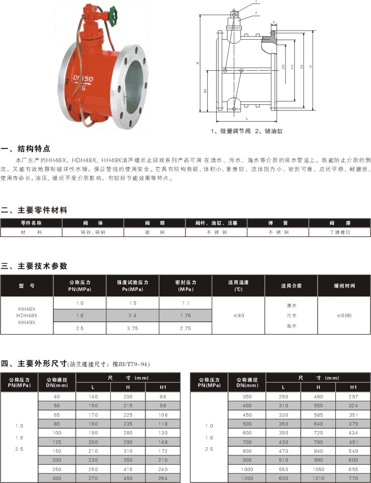公稱通徑:DN40-700 壓力等級(jí):PN1.0-2.5MPa 材質(zhì):碳鋼 產(chǎn)品概述 微阻緩閉止回閥用于給排水管道,安裝在水泵出口處用來(lái)防止介質(zhì)逆流和消除破壞性水錘,并且有效地減少閥門關(guān)閉水錘壓力,可保障管網(wǎng)安全運(yùn)行。止回閥具有閥瓣輕、開(kāi)度大、節(jié)電效果顯著,流體阻力小,水錘消除機(jī)構(gòu)設(shè)計(jì)新穎,密封性能穩(wěn)定可靠、耐磨損、使用壽命長(zhǎng)、運(yùn)行平穩(wěn)、無(wú)振動(dòng)、無(wú)噪聲等特點(diǎn)。 止回閥主要技術(shù)參數(shù) 公稱壓力:1.0~2.5MPa 公稱通經(jīng):40~800mm 適用介質(zhì):水、弱腐蝕性液體 適用溫度:0~80℃(如需要,可達(dá)200℃) 法蘭標(biāo)準(zhǔn):GB/T 17241.6 GB/T 9113 試驗(yàn)標(biāo)準(zhǔn): GB/T 13927 AP1598 主要零部件材料 零件名稱 閥體、閥蓋 閥瓣 閥軸 材料 灰鑄鐵、鑄鋼 鋼板、橡膠組合件 不銹鋼